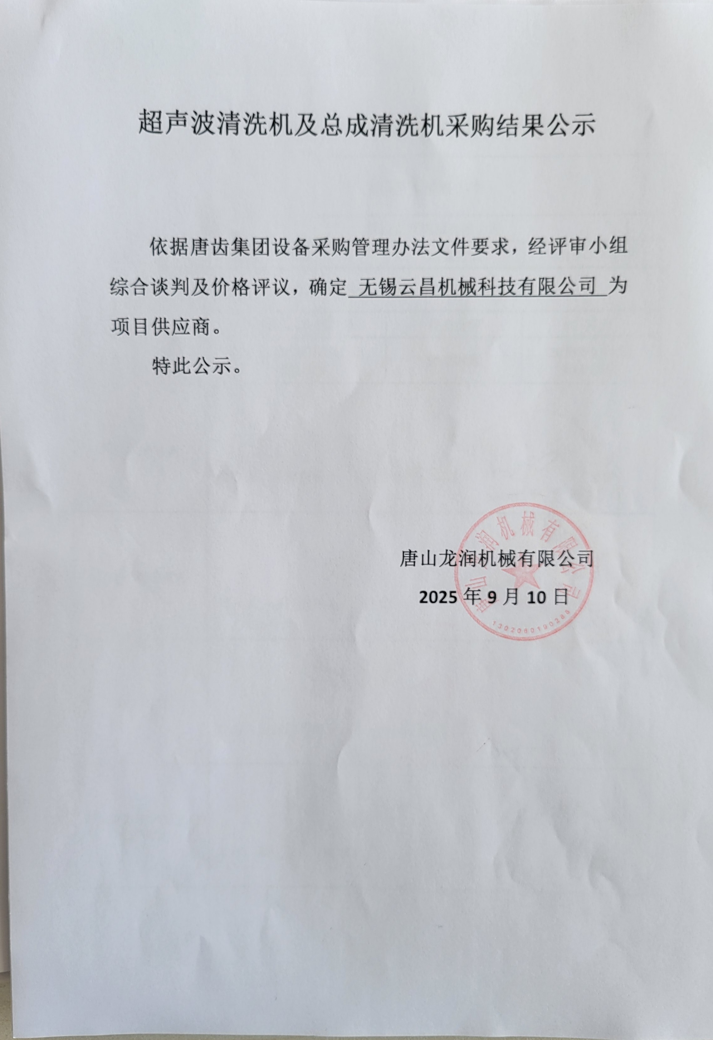 唐山龙润机械有限公司超声波清洗机及总成清洗机采购结果公示